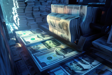 Process of printing dollar banknotes. Printing machine prints money. Economic and finance concept. Created with Generative AI