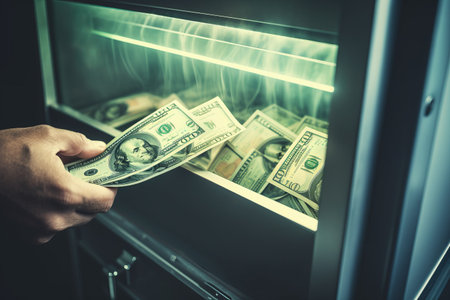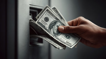 ATM machine dispensing cash with a close-up of hand pulling out bills, symbolizing financial access