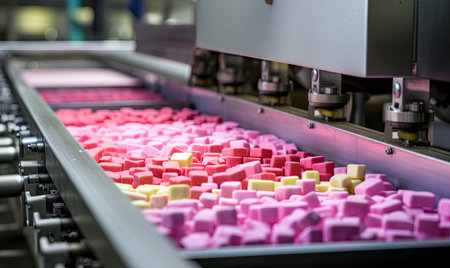 A conveyor belt filled with lots of pink and yellow squares
