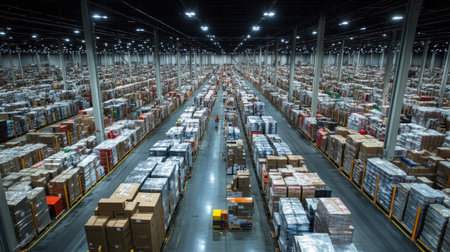 Aerial view of a massive warehouse filled with neatly organized pallets and boxes. The facility highlights the efficiency of modern logistics and storage solutions.