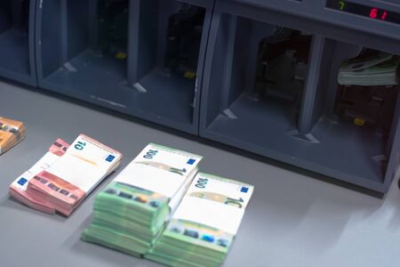 Sorted banknotes placed on the table after it is counted on the electronic money counting machine