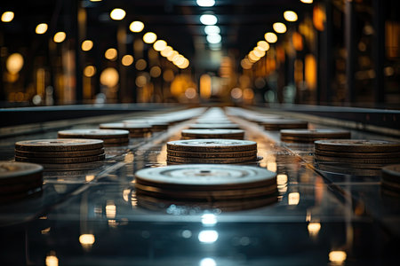 Pile of gold coins money stack in finance treasury deposit bank account saving . Concept of corporate business economy and financial growth by investment in valuable asset to gain cash revenue .