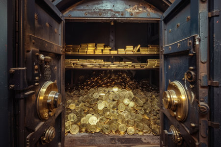 This image showcases a secure vault interior filled with gleaming gold bars stacked high, emphasizing a world of wealth and security in modern finance.