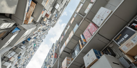 Captivating aerial view showcasing an automated warehouse filled with conveyor belts and shelves neatly organized with goods, embodying efficiency and modern logistics.