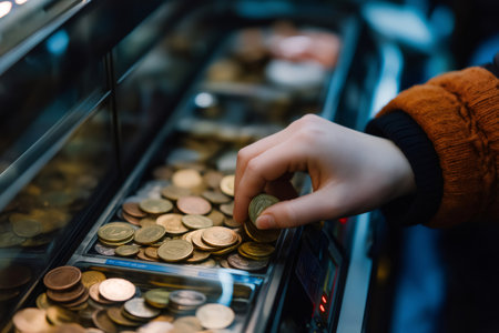 Cashier's hand retrieving coins from an electronic counting machine while processing transactions in a busy supermarket setting