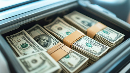 Numerous stacks of us dollar bills are neatly arranged in a metal container, creating an image of abundance and security