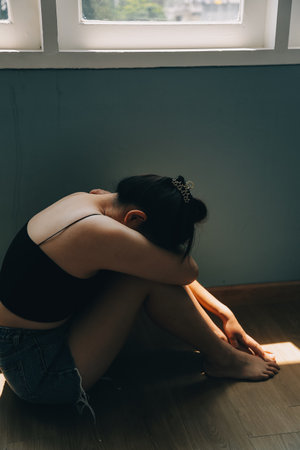 A woman sitting alone and depressed. The depression woman sit on the floor, abuse and people concept