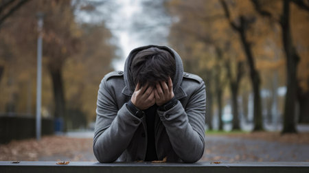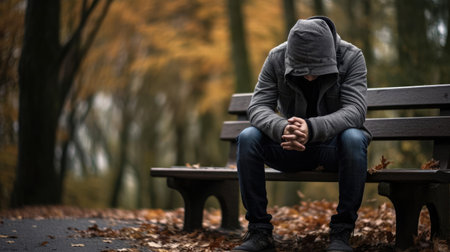 A young man sits alone on a park bench with his head bowed and hands clasped, appearing sad and deep in thought. The image conveys themes of depression, loneliness, mental health struggles, and solitude in an outdoor setting.