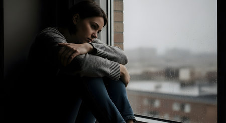 Woman with a mental health illness sitting sad near the window