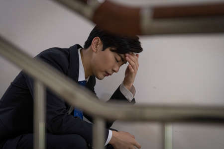 Asian businessman Wearing white shirt and holding hot coffee sitting stress unemployed on staircase with work sunset background.