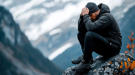 A man wearing a black hoodie, black beanie, and black jeans sits on a textured rock, holding his head in his hands, appearing contemplative or distressed.