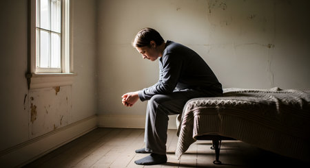 A person sits slumped on the edge of a bed in a sparsely furnished room with peeling paint, looking down in despair. The natural light from the window highlights the solitary and melancholic atmosphere of the scene.