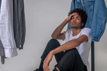 Curly-haired young guy sitting near the hangers with clothes and looking sad