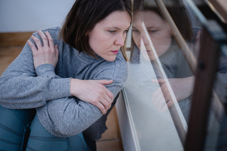 Anxiety disorder menopause woman, stressful depressed emotional person with mental health illness, headache and migraine sitting feeling bad sadly with back against wall on the floor in domestic home