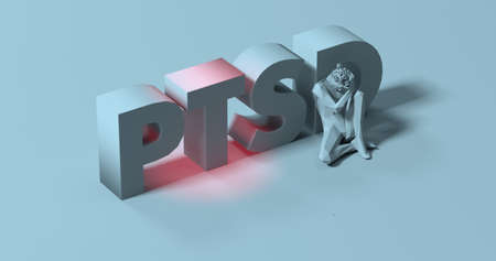 Depressed sad man sitting near PTSD text sign, 3d render illustration
