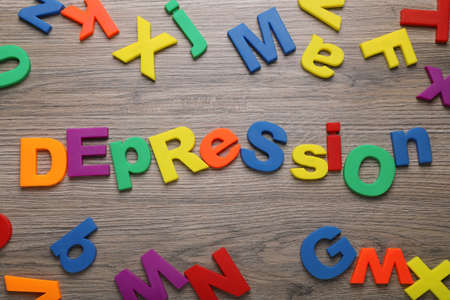 Word Depression made of colorful letters on wooden table, flat lay