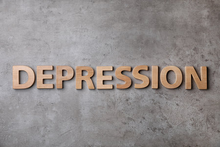 Word Depression made of wooden letters on gray background, top view