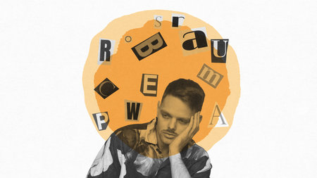 Bored young man leaning his head on hand, with flying letters around him symbolizing chaos. Contemporary art collage.