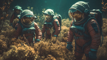 The astronauts-scientists are studying a foreign green deserted planet. 3D Rendering.