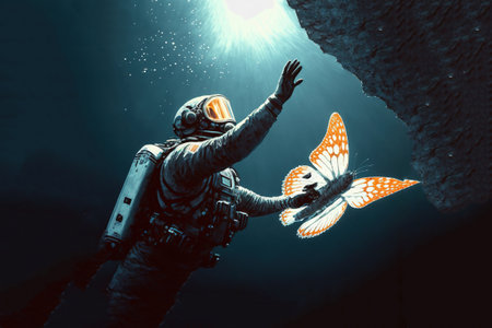 The astronaut reaching out to catch the glowing butterfly in the sky, digital art style, illustration painting, fantasy concept of a astronaut with the butterfly