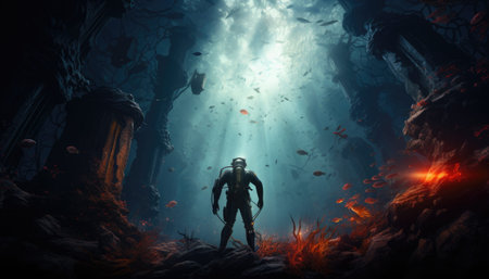 Experience the thrill of deep sea exploration as a diver ventures into a mysterious underwater cave, bathed in dramatic sunbeams illuminating ancient formations. Evokes wonder and adventure.