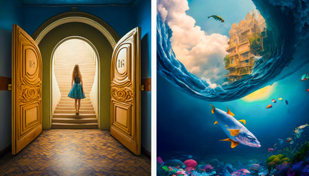 Two pictures of an open door and fish in the water. Generative AI.