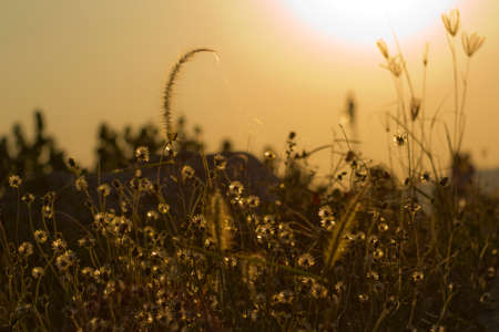 Meadow flowers, beautiful fresh in soft warm light. Vintage autumn landscape blurry natural background.