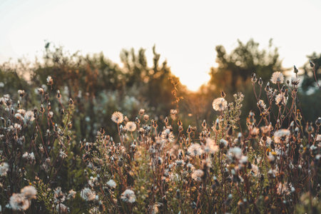 meadow flowers in soft warm light. Vintage autumn landscape blurry natural background.