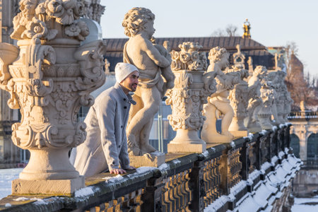 Happy young Asian traveler in a light coat traveling around the world. Seeing the sights of the new place. Stands among the monuments. Dresden, Germany