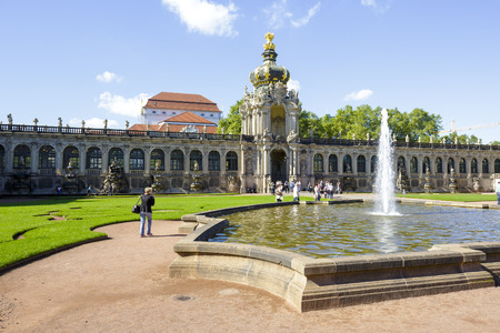 DRESDEN, GERMANY - SEPTEMBER 4: Tourists at the Zwinger palace in Dresden, Germany on September 4, 2014. By 1963 the Zwinger had largely been restored after it was completely destroyed 1945. Foto taken from the public Zwinger park.