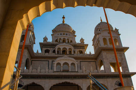 An ancient Hindu temple in Pushkar in India. Temple on a background blue sky.