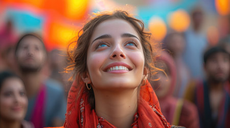 A woman with a scarf on her head is smiling and laughing. She is surrounded by other people who are also smiling and laughing. Scene is happy and joyful