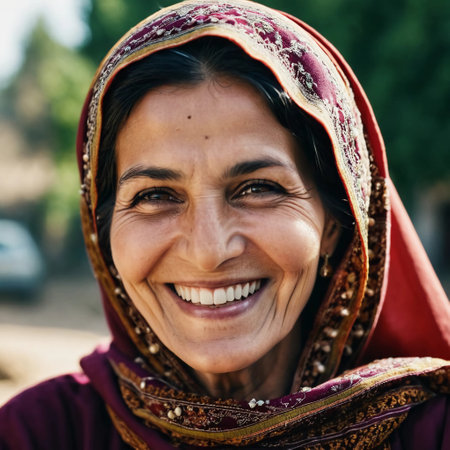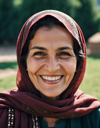 A joyful woman 45 years old from Afghanistan displays a bright smile while wearing traditional clothing. She stands confidently, embodying a sense of peace in her rural community. Generative AI.