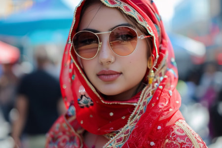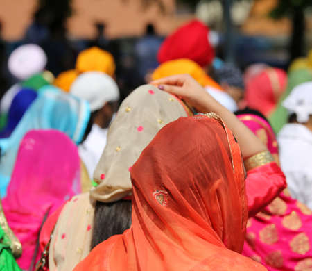 sikh young woman with colourful clothes during a religious ceremony