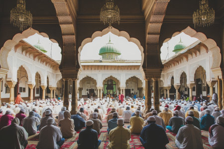 A diverse crowd of individuals gathered inside a spacious building, all seated together, A mosque's courtyard filled with worshippers, AI Generated