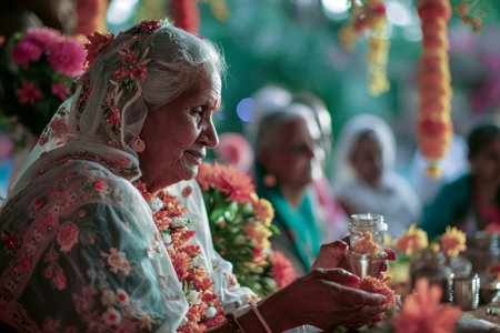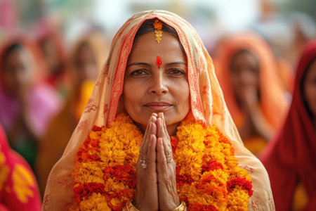 Portrait of a woman praying with a garland of flowers during a religious ceremony in India