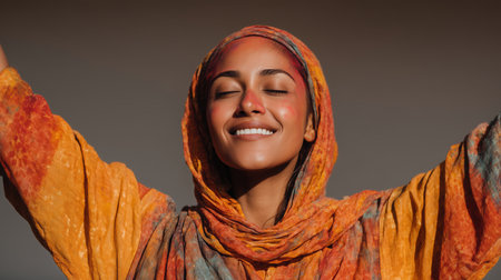 A joyful woman from Afghanistan smiles warmly, displaying a sense of resilience. Her colorful scarf reflects cultural heritage as she sits in her inviting home environment. Generative AI.