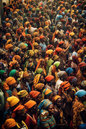 A vibrant scene showcasing a diverse group of women draped in colorful scarves, gathered in a misty landscape, reflecting cultural richness and unity.