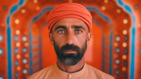 Portrait of a bearded man in a turban and orange shirt.
