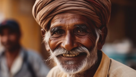 Portrait of a bearded Indian man in traditional clothes at a fair