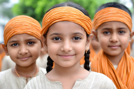 Portrait of happy Indian kids wearing traditional orange headbands and smiling