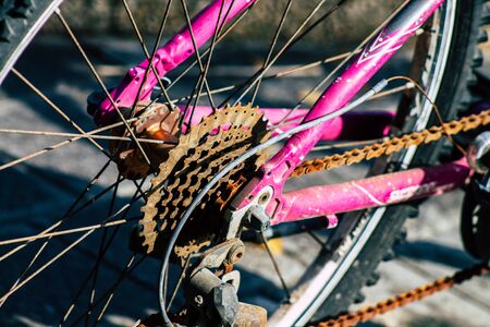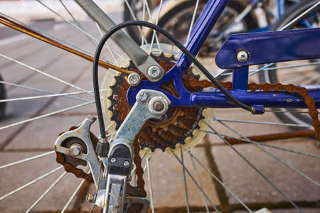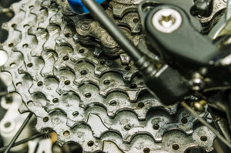 Close up view of the mountain bike rusty sprocket with gear and chain at the back tyre of bicycle due to poor maintenance.