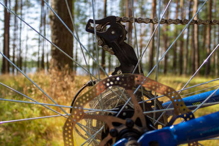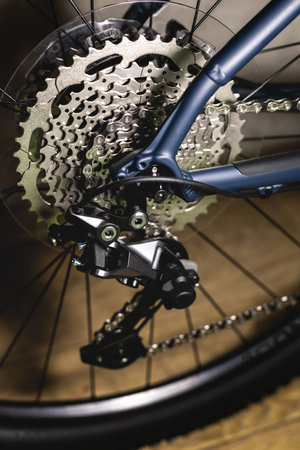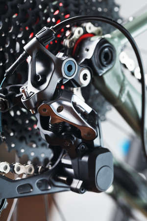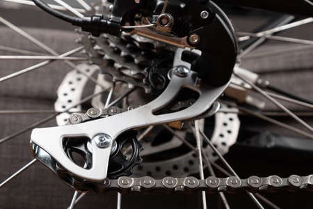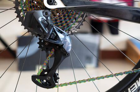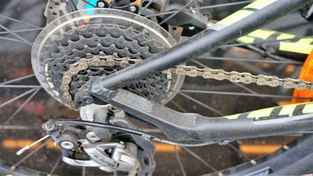Mountain bike rear derailleur close-up. Rear racing bike cassette on the wheel with chain