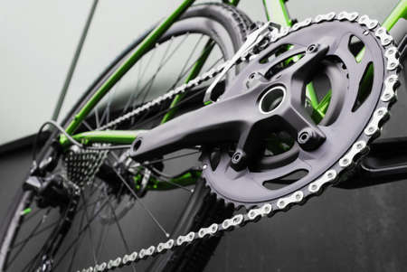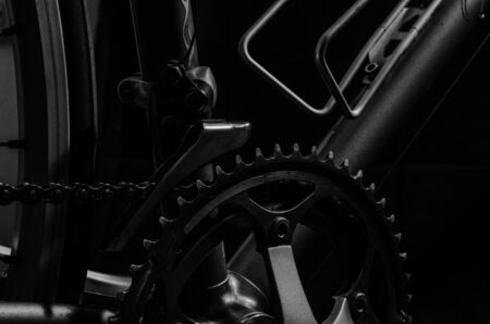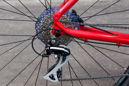The system gear on the rear black wheel and chain tension on the professional sports bicycle.
