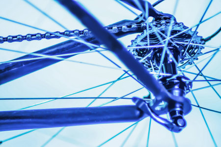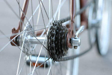 Photograph of a bicycle chain and spokes closeup and blurred background