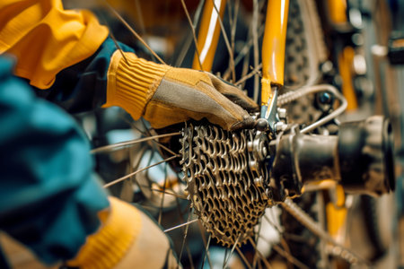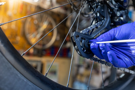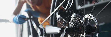 Mechanic serviceman repairman installing assembling or adjusting bicycle gear.