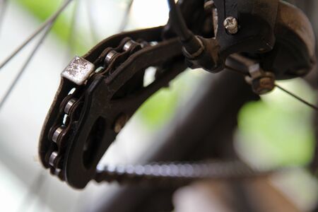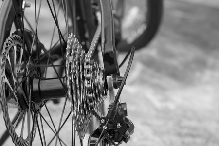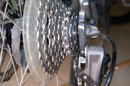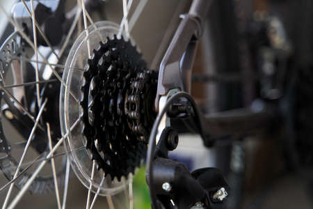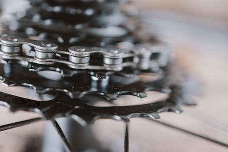Closeup of a bicycle gears mechanism and chain on the rear wheel of mountain bike.