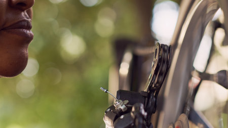 Sports-loving black woman cautiously greasing and maintaining her bike disc brake ring outside. Close-up view of female carefully lubricating rusty bicycle with chain lubricant.