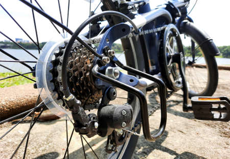 Bicycle gear wheels in close up with mechanic gears cassette and chain at the rear wheel of folding bike