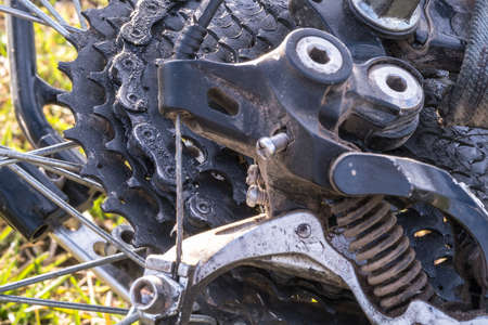 Mountain bike used and dirty gear cassette cogs macro close up shot outside